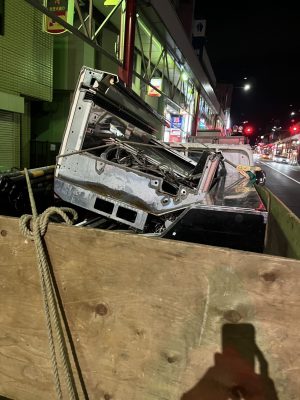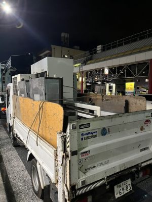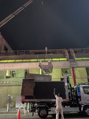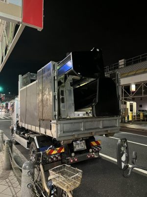 冷蔵庫ショーケース11台の搬出の為、人通り・車通りの少ない夜の時間での搬出です💦